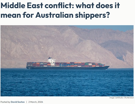 Escalating conflict in the Middle East has resulted in immediate cost pressures for Australian importers and exporters, with shipping lines introducing war-risk surcharges and adjusting services through key global hubs.