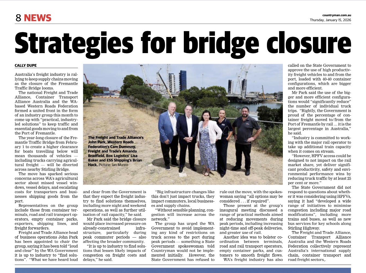 The national Freight and Trade Alliance, Container Transport Alliance Australia and the WA-based Western Roads Federation formed a united front in the form of an industry group this month to come up with "practical, industry-led solutions" to keep traffic and essential goods moving to and from the Port of Fremantle.
