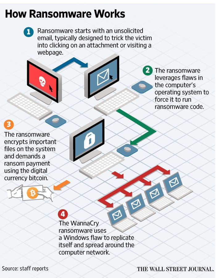 To date, over 200,000 attacks have occurred in 150 countries, including Australia. The self-replicating virus was able to enter company networks when unassuming employees clicked on these email attachments. Ransom notes were then sent to those affected demanding sums up to US$300 within 2 hours (before prices would double) in exchange for their data being released. This type of attack has been coined "Ransomware" and we have shared a pictograph of how this virus works, courtesy of The Wall Street Journal.